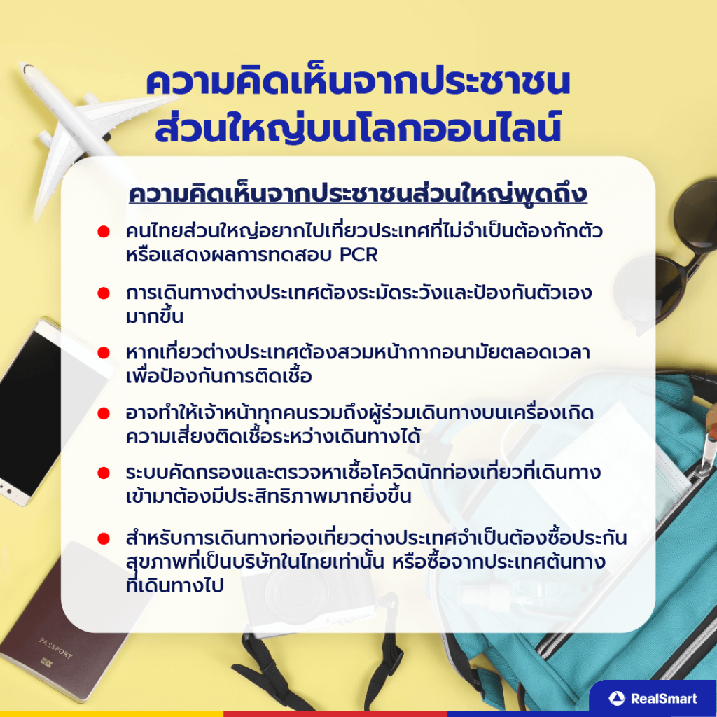 ในภาพรวมทั้งหมดจะเห็นได้ว่าคนไทยนั้นอยากที่จะไปเที่ยวต่างประเทศกัน แต่ว่ายังมีความกังวลต่อการแพร่ระบาดของโควิด โดยเฉพาะบนเครื่องบินที่เป็นสถานที่ปิดเสี่ยงต่อการติดเชื้อได้ง่ายทำให้ต้องระมัดระวังเป็นพิเศษ และต้องมีการคัดกรองและตรวจหาเชื้ออย่างเข้มงวด หากใครจะไปเที่ยวจะต้องซื้อประกันสุขภาพเผื่อไว้ด้วย