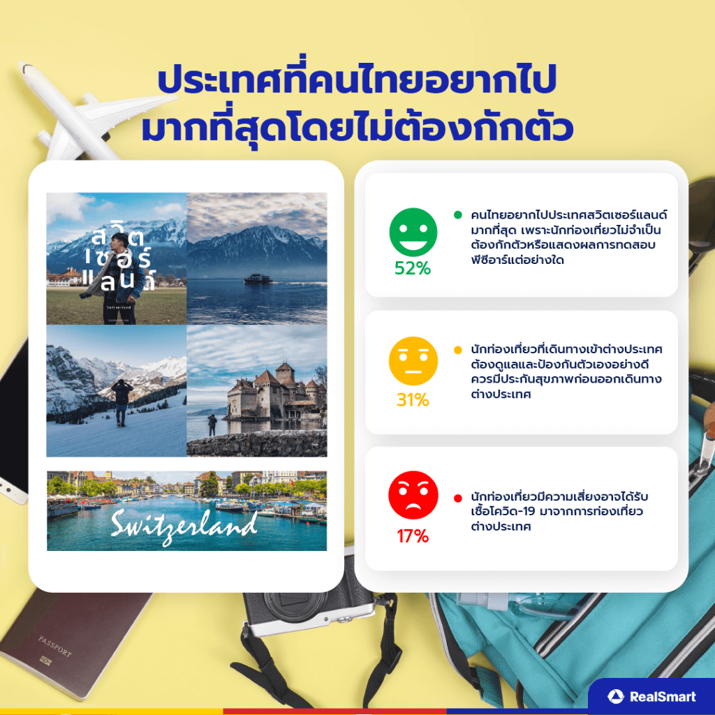 ข้อมูลที่ Real Smart ได้มานั้นมีประเด็นที่คนในพูดถึงกันมากที่สุดอยู่ 2 ประเด็น คือ ประเทศที่อยากไปเที่ยวกันมากที่สุดโดยไม่ต้องกักตัว และ มาตรการเดินทางเข้าประเทศไทย ซึ่งจะเห็นได้ว่าทั้ง 2 ประเด็นนั้นเกี่ยวข้องกัน เพราะคนไทยจะไปเที่ยวต่างประเทศนั้นจะต้องหาข้อมูลทั้งขาไป – ขากลับเข้าประเทศไทยนั้นว่ามีมาตรการอะไรบ้าง เพื่อวางแผนก่อนไปท่องเที่ยว ที่นี้มาเจาะลึกลงไปในแต่ละประเด็นกันว่าคนไทยมีความคิดเห็นและความรู้สึกอย่างไรกันบ้าง