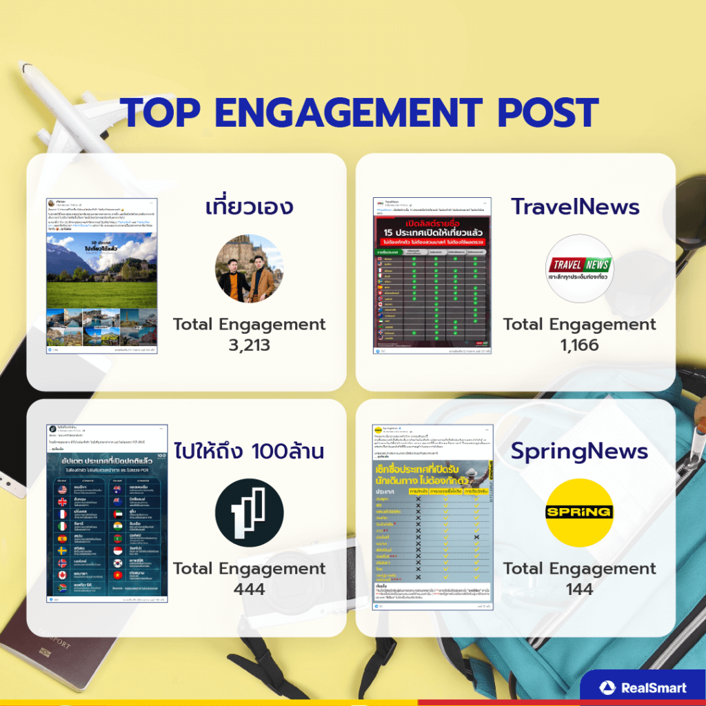 โดยที่ทั้ง 4 โพสต์ที่ได้รับ engagment สูงนั้นเกิดจากการอัปเดตข้อมูลเกี่ยวกับประเทศที่เปิดให้เข้าไปเที่ยวได้แบบไม่ต้องกักตัว มีทั้งเพจท่องเที่ยว เพจสำนักข่าว และเพจอื่น ๆ