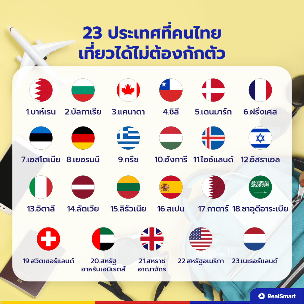 Real Smart ได้รวบรวมรายชื่อทั้ง 23 ประเทศที่เปิดให้นักท่องเที่ยวเข้าได้โดยไม่ต้องกักตัว โดยประเทศส่วนใหญ่จะอยู่ในโซนยุโรปมากที่สุด ตามมาด้วยในส่วนของโซนเอเชียนั้นมีอยู่ 4 ประเทศ ในโซนอเมริกาเหนือและใต้ 3 ประเทศ และยังมีอีกหลายประเทศที่กำลังจะเปิดให้นักท่องเที่ยวเข้าไปท่องเที่ยวกันในไม่ช้านี้