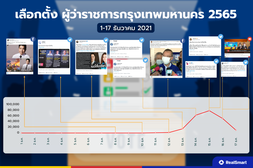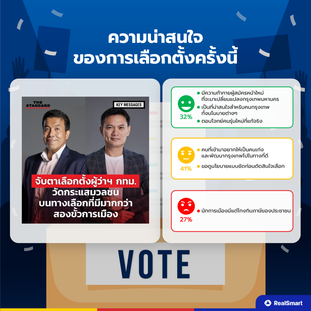เรื่องนี้กลายเป็นที่จับตามองกันอย่างมากไม่ใช่แค่เฉพาะคนในพื้นที่เท่านั้น แต่คนจังหวัดอื่น ๆ ก็สนใจการเลือกตั้งครั้งนี้เช่นกัน ทาง Real Smart ได้ใช้ Social Listening Tools เก็บรวบรวมข้อมูลเกี่ยวกับกระแสการเลือกตั้งผู้ว่าฯ กทม. ในโลกออนไลน์ และได้ทำการแบ่งเป็นประเด็นต่าง ๆ ออกมา