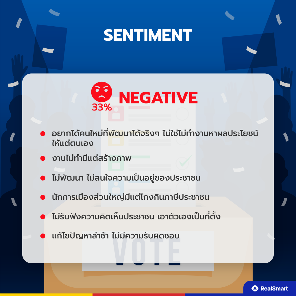 Negative Sentiment 33% อยากได้คนใหม่ที่พัฒนาได้จริง ๆ ไม่ใช่ไม่ทำงานหาผลประโยชน์ให้ตัวเอง โกงกินภาษีประชาชน ไม่รับฟังปัญหา ไม่ทำงานสร้างภาพอย่างเดียว