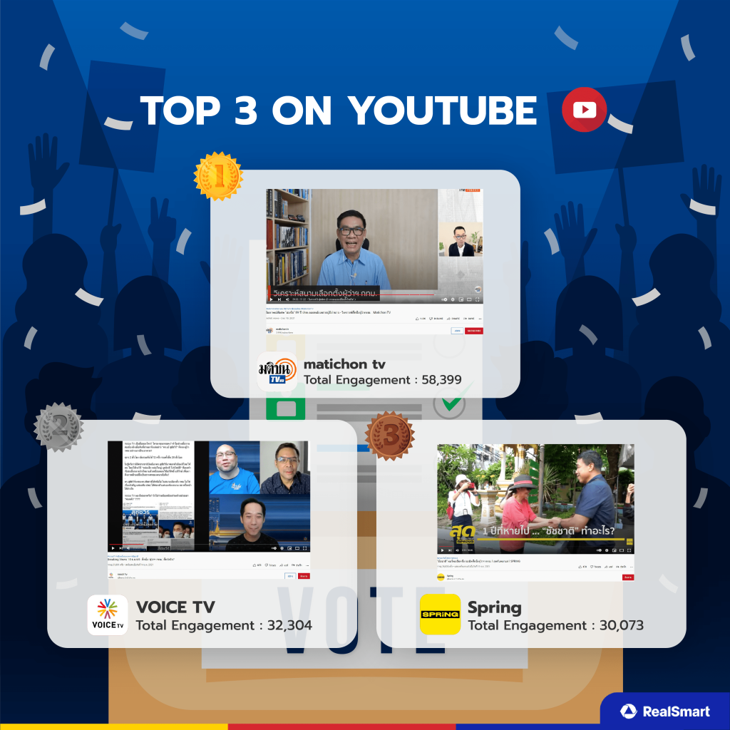 ช่องทาง YouTube เป็นอีกช่องทางที่ทุกคนเข้ามาเสพข่าวสารกันได้เสมอ โดยทั้ง 3 ช่องเป็นช่องของสำนักข่าวชื่อดังระดับประเทศ ทำให้มี Engagement สูง