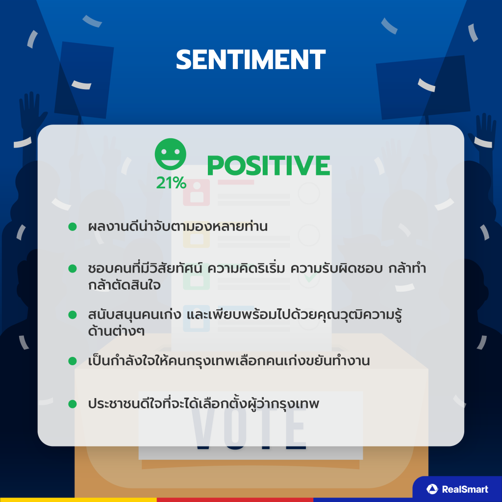 Positive Sentiment 21% มองว่าหลายคนมีผลงานที่ดีน่าจับตามอง และชอบคนที่มีวิสัยทัศน์ ความคิดริเริ่ม ความรับผิดชอบ กล้าทำ กล้าตัดสินใจ พร้อมสนับสนุนคนเก่ง และเพียบพร้อมไปด้วยคุณวุฒิความรู้ด้านต่าง ๆ รวมถึงประชาชนดีใจที่จะได้เลือกตั้ง