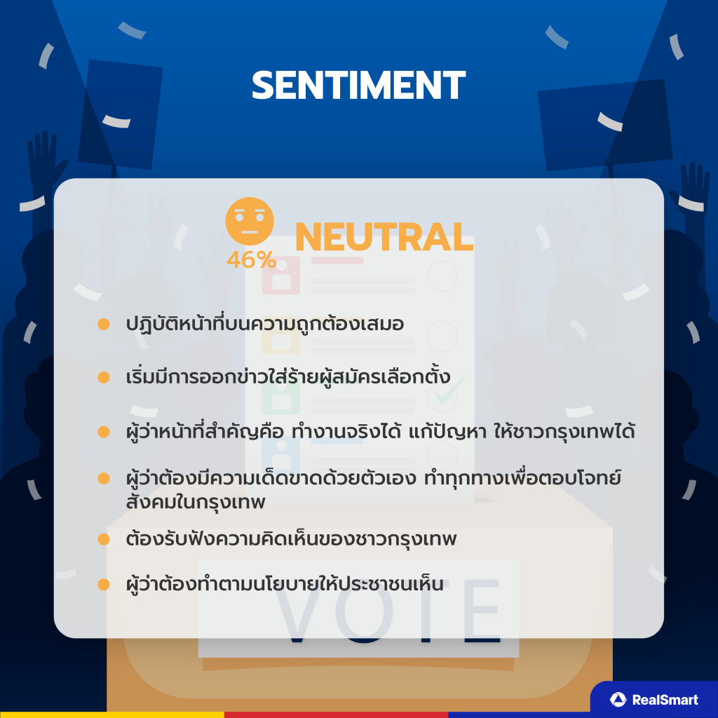 Neutral Sentiment 46% อยากให้ผู้ที่ได้รับเลือกนั้นปฏิบัติหน้าที่บนความถูกต้องเสมอ และทำตามนโยบายที่เคยกล่าวไว้ อีกทั้งผู้ว่าฯ มีหน้าที่สำคัญคือ ทำงานจริงได้ แก้ปัญหาให้ชาวกรุงเทพฯ ได้และต้องมีความเด็ดขาดด้วยตัวเอง ทำทุกทางเพื่อตอบโจทย์สังคมคนกรุงเทพฯ รวมถึงรับฟังความคิดเห็นจากประชาชน