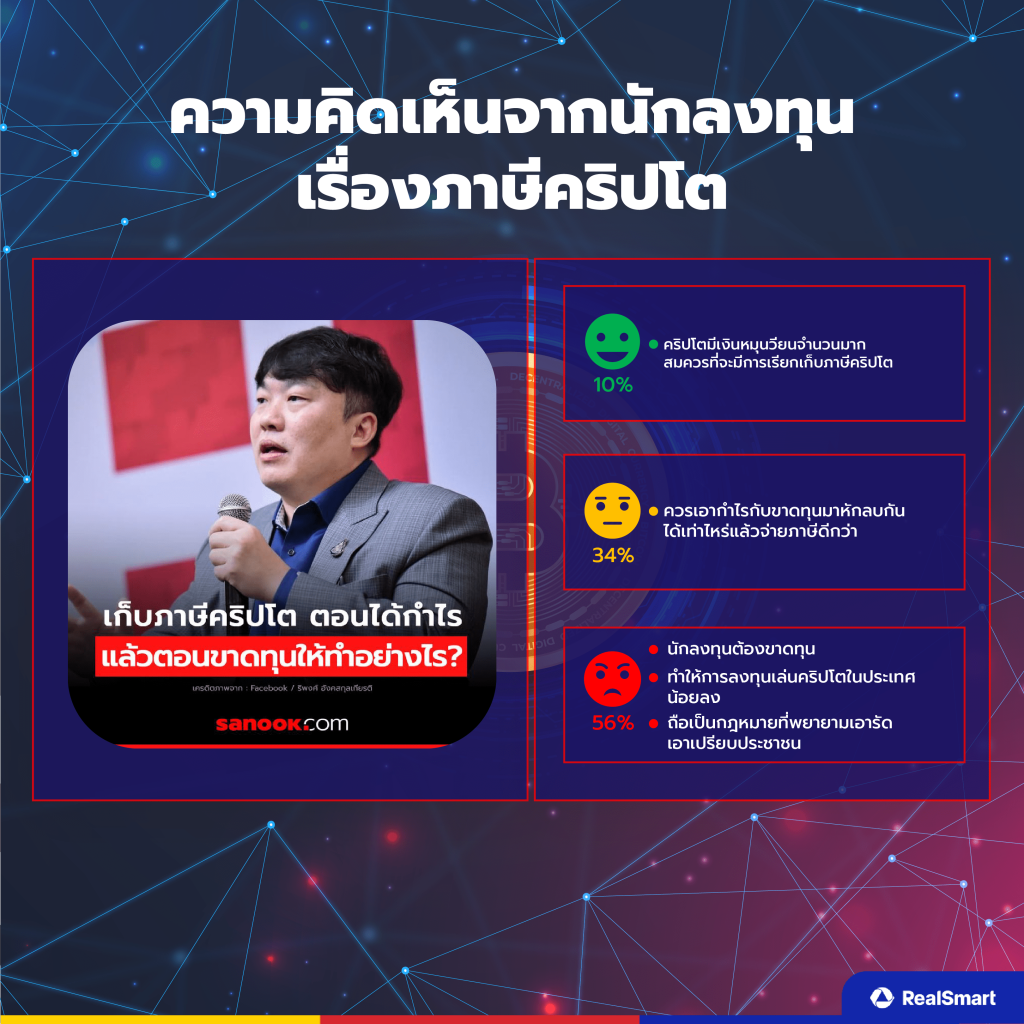 มีเพียง 10% ที่มองว่าควรเรียกเก็บภาษีจากนักลงทุน อีก 33% ที่มาสอบถามเรื่องการโอนเงินสกุลดิจิทัลเปลี่ยนเป็นเงินไทยจะเสียภาษีไหม ส่วนอีก 57% ไม่เห็นด้วยกับการเรียกเก็บภาษีจากนักลงทุน การเก็บถึง 15% นั้นเอาเปรียบมากเกินไป ทำให้ไม่มีใครอยากลงทุนอีก