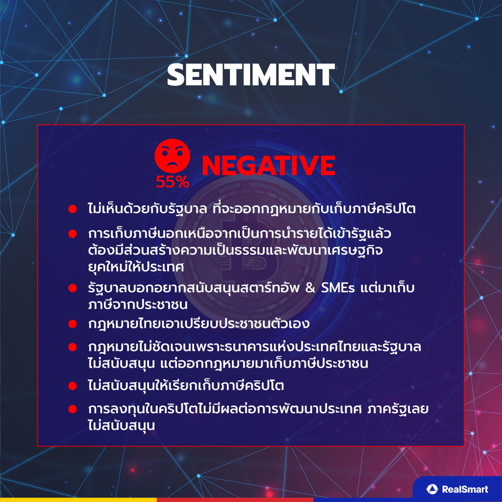 - Negative Sentiment (ความเห็นเชิงลบ) 55% ส่วนใหญ่ไม่เห็นด้วยกับรัฐบาลที่ออกกฎหมายการเก็บภาษีคริปโตนั้นเอาเปรียบประชาชน แทนที่จะมาเก็บภาษีอยากให้รัฐบาลสนับสนุนสตาร์ทอัพ กับ SMEs มากกว่า