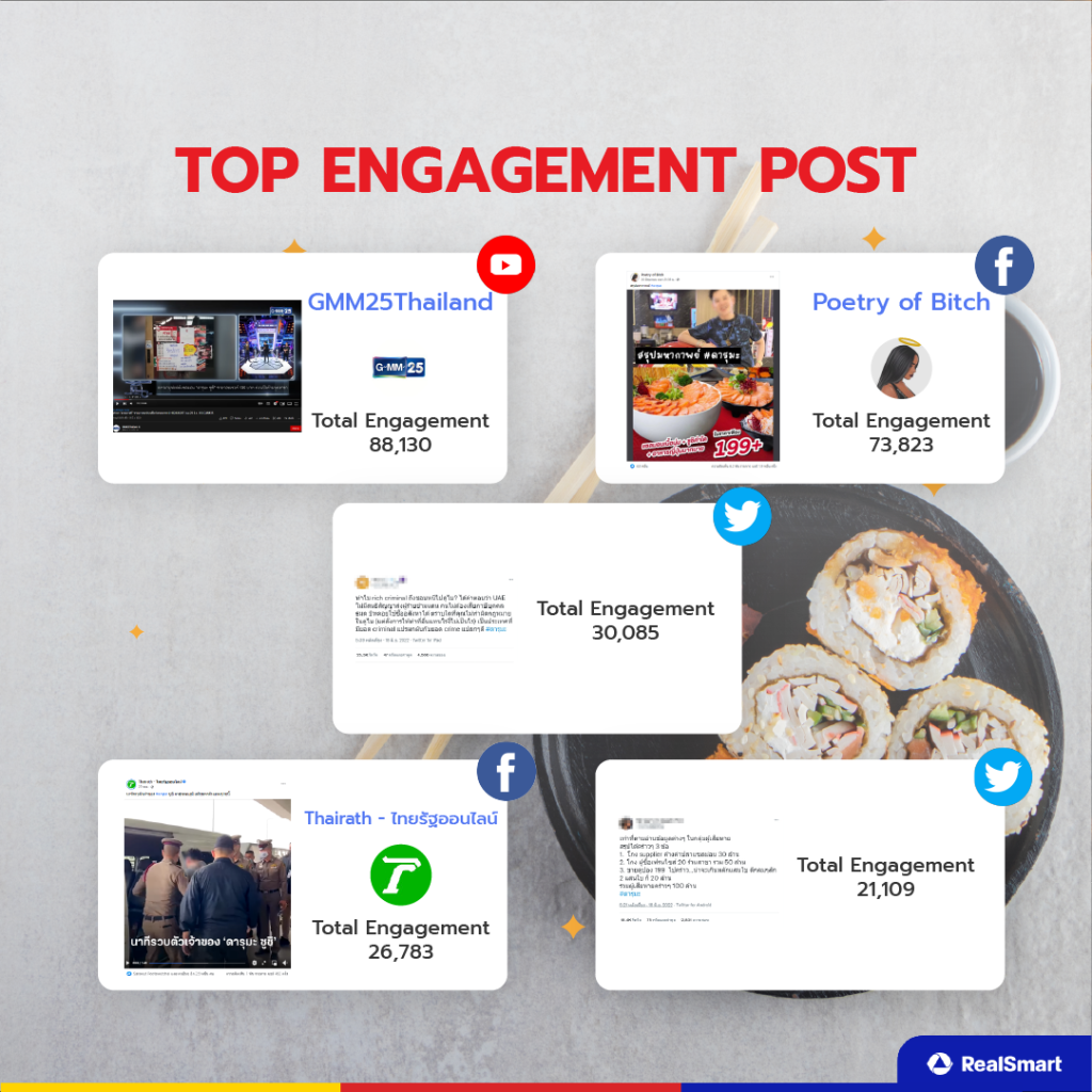 พบ Top Engagement ในช่องทางต่าง ๆ ทั้ง Facebook YouTube และ Twitter เกี่ยวกับร้านดารุมะซูชิ โดยทั้ง Facebook และ Twitter มีโพสต์ที่ได้รับ engagement สูงเพราะเป็นช่องทางที่คนไทยนิยมไว้ติดตามเหตุการณ์ที่เกิดขึ้นได้รวดเร็ว ส่วนช่องทาง YouTube เป็นอีกช่องทางที่คนไทยดูข่าวย้อนหลังได้เช่นกัน