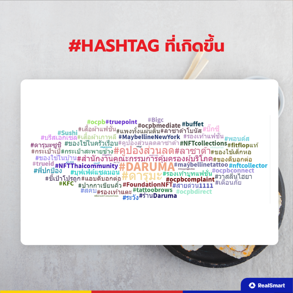 Top #Hashtag ที่เกิดขึ้นเกี่ยวกับประเด็นคูปองทิพย์ของร้านดารุมะซูชินั้นมีอยู่มากมาย แต่ที่เห็นได้ชัดเจนที่เป็นภาษาไทยและภาษาอังกฤษ #ดารุมะ #คูปองส่วนลด #DARUMA #สำนักงานคณะกรรมการคุ้มครองผู้บริโภค และอื่น ๆ หากใครสนใจสามารถไปตามดูใน Hashtag เกิดขึ้นได้เช่นกัน