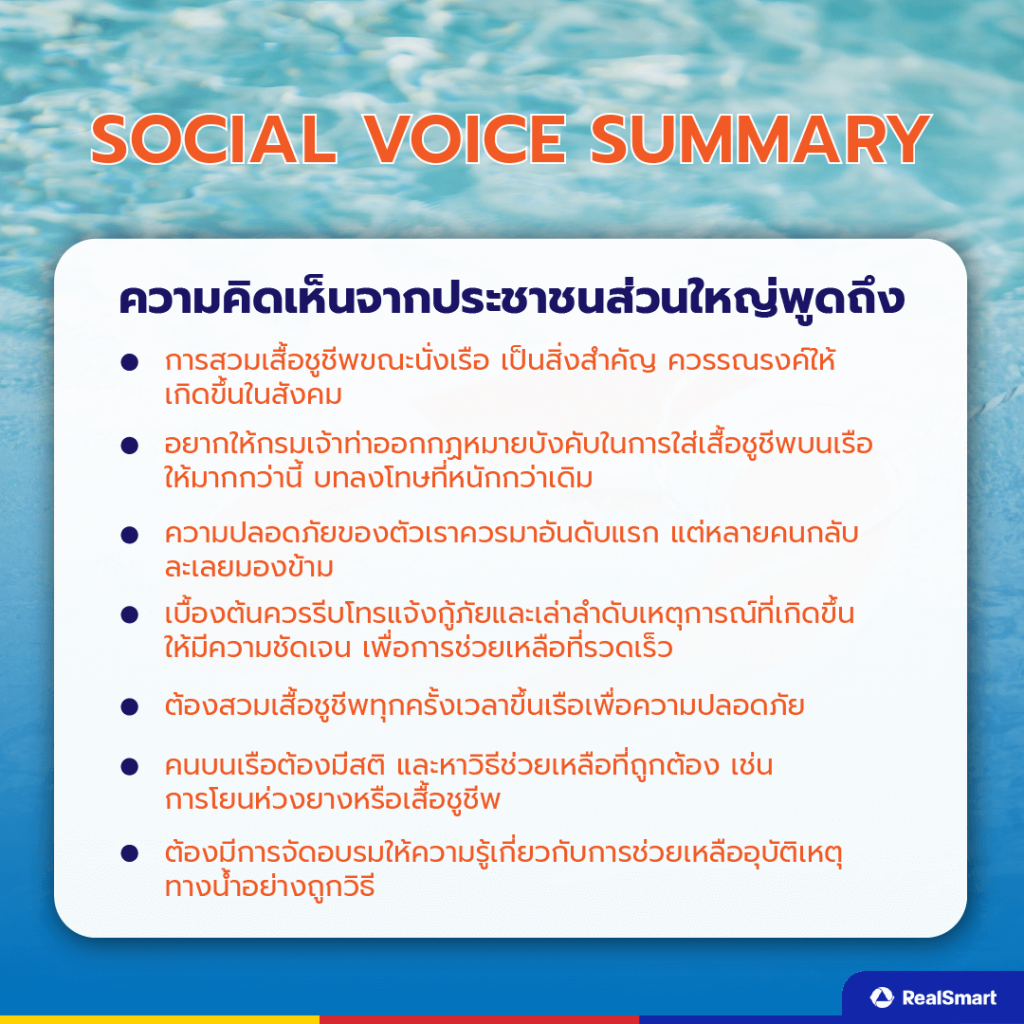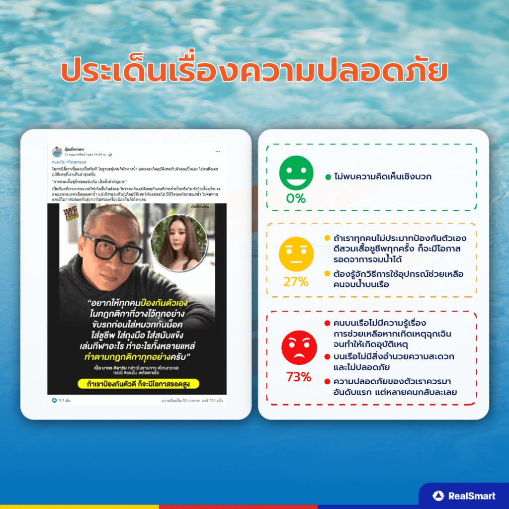 ในประเด็นนี้ไม่มีใครออกมาแสดงความเห็นเชิงบวก (Positive Sentiment) เลยแม้แต่คนเดียว  ในส่วนของความเห็นเชิงทั่วไป (Neutral Sentiment) มีอยู่ 27% ที่ไปในเชิงแสดงความคิดเห็นหรือเสนอแนะแนะทางมากกว่า เช่น ถ้าเราไม่ประมาทกับตัวเองสวมเสื้อชูชีพทุกครั้ง ก็มีโอกาสรอดจากคนจมน้ำ และอยากให้เรียนรู้วิธีการใช้อุปกรณ์ช่วยเหลือคนจมน้ำที่มีอยู่บนเรือ และมีความเห็นเชิงลบ (Negative Sentiment) ที่เป็นในเชิงตำหนิสูงถึง 73% บอกว่าคนบนเรือไม่มีความรู้เรื่องการช่วยเหลือ อีกทั้งบนเรือไม่มีสิ่งอำนวยความสะดวก และไม่มีความปลอดภัย และหลายคนกลับละเลยความปลอดภัยของตัวเอง