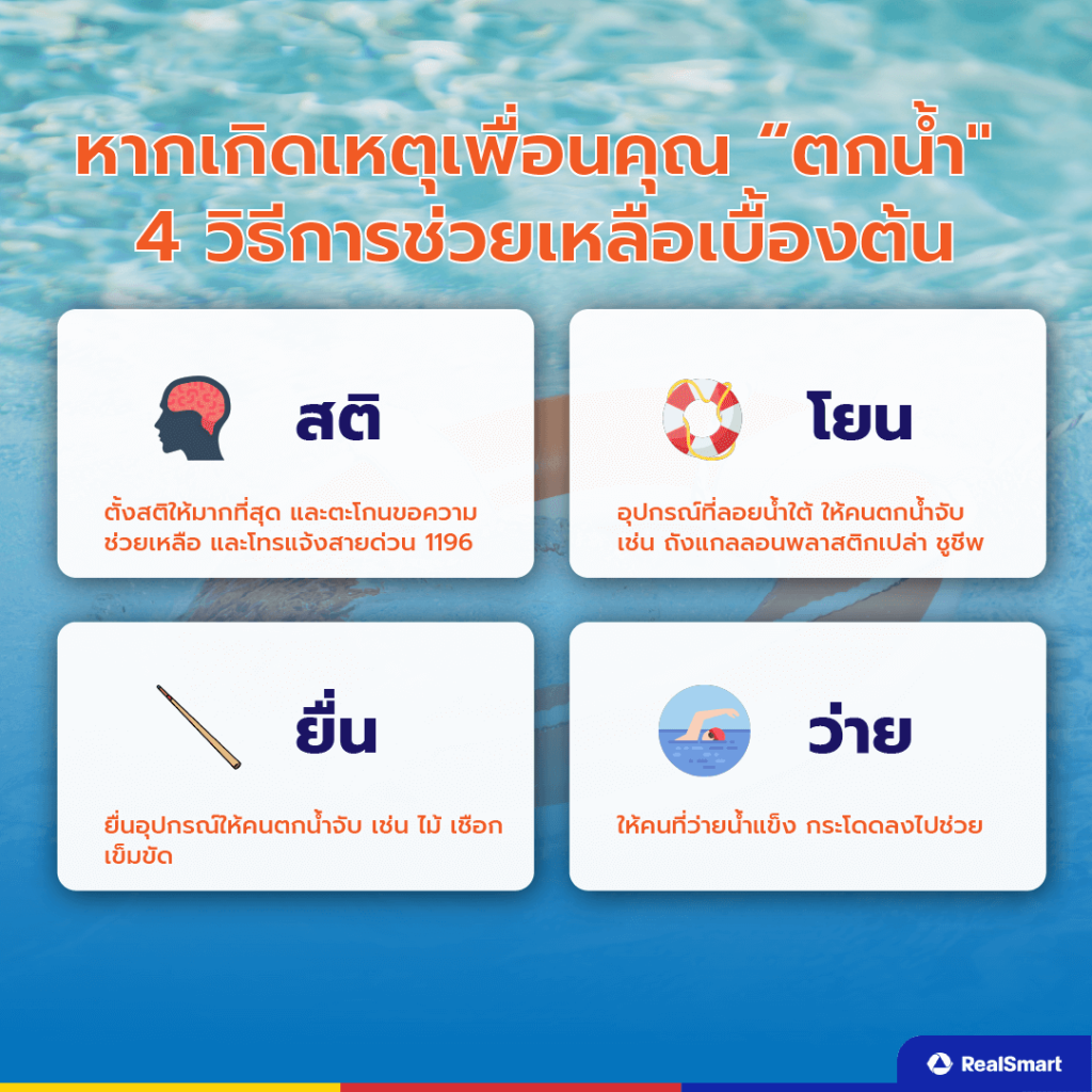 แล้วหากเกิดเหตุการณ์เพื่อนคุณ ตกน้ำ ทาง Real Smart อยากให้คุณจำ 4 วิธีช่วยเหลือเบื้องต้นนี้ไว้ คือ สติ โยน ยื่น ว่าย เพื่อช่วยเพื่อนคุณได้ทันท่วงที