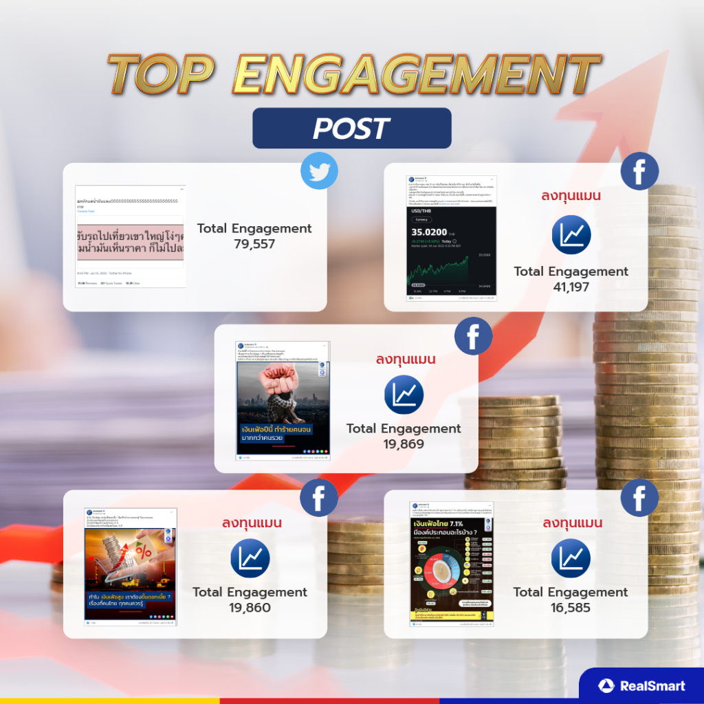 ในส่วนของ Top Engagement post พบว่า Facebook และ Twitter เป็นช่องทางที่คนไทยติดตามปัญหาเงินเฟ้อ โดยเฉพาะเพจลงทุนแมนที่ได้อธิบายถึงปัญหาเงินเฟ้อทำให้รับความสนใจจากคนไทยสูง ส่วน Twitter ที่ได้รับความสนใจสูงจากการ Tweet เรื่องค่าน้ำมันแพงไปในทางตลกขำขัน