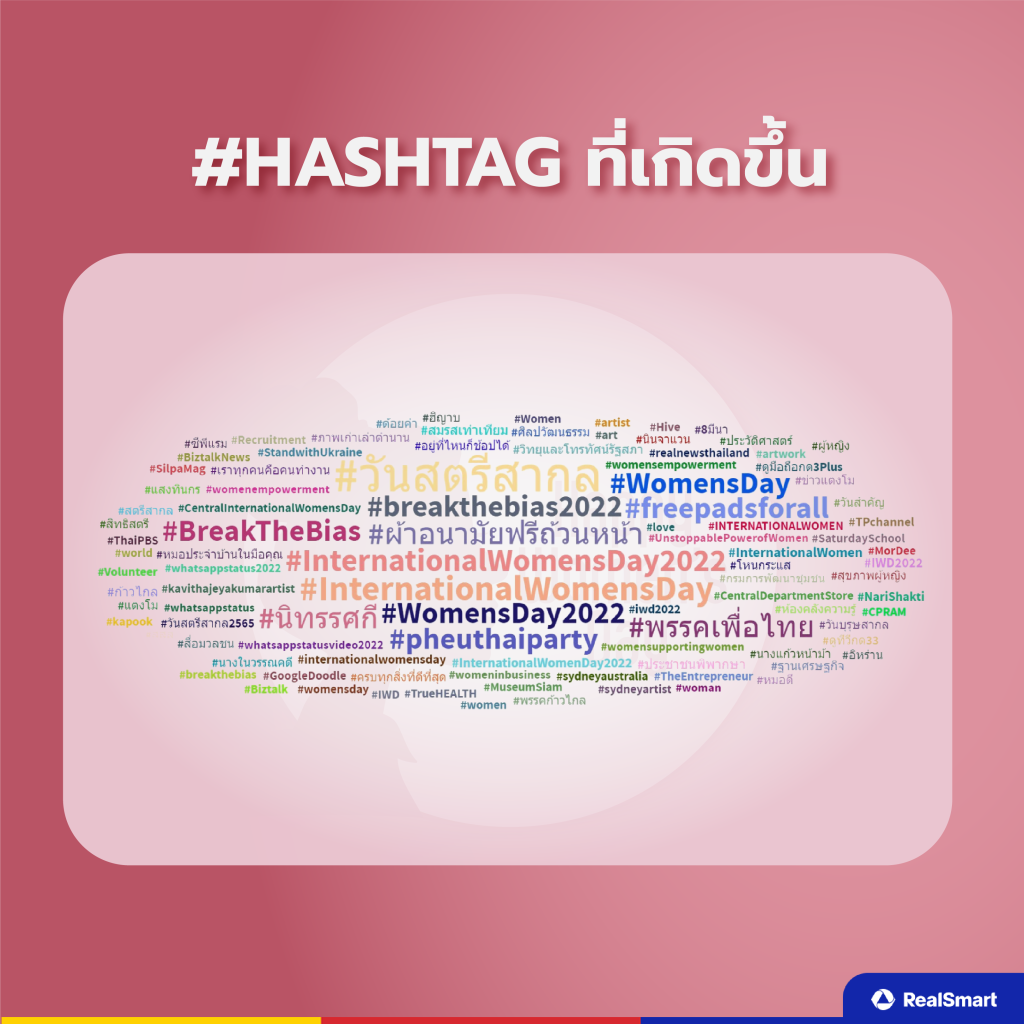 Top #Hashtag ที่เกิดขึ้นเกี่ยวกับวันสตรีสากลนั้นอยู่มากมาย แต่ที่เห็นได้ชัดเจนจะเป็น #ผ้าอนามัยฟรีถ้วนหน้า #InternationalWomensDay2022 #WomensDay และอื่น ๆ หากใครสนใจสามารถไปตามดูใน Hashtag เกิดขึ้นได้เช่นกัน