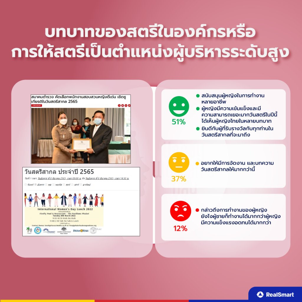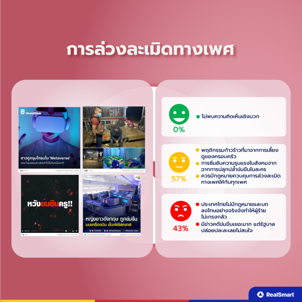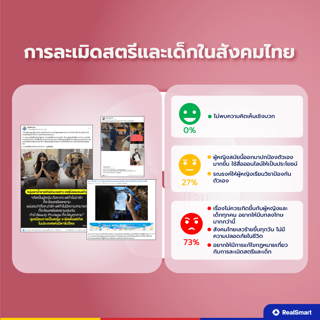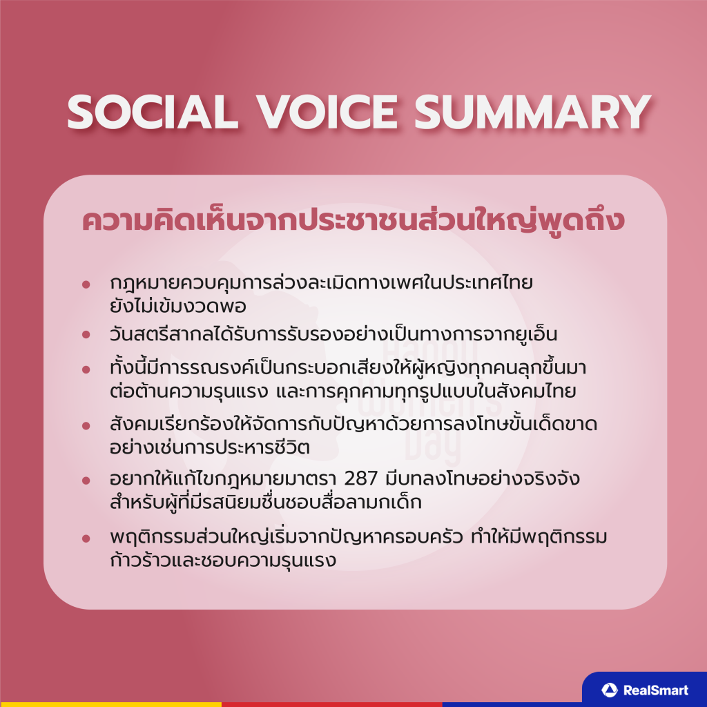 ในส่วนของประเด็นที่ได้รับความสนใจนั้น Real Smart ได้ทำการแยกข้อมูล และได้ประเด็นออกมาอยู่ 3 ประเด็น ได้แก่ การละเมิดสตรี และเด็กในสังคมไทย การล่วงละเมิดทางเพศ และบทบาทของสตรีในองค์กร หรือการให้สตรีมีตำแหน่งผู้บริหารระดับสูง ต่อไปเรามาเจาะลึกลงไปทีละประเด็นกัน