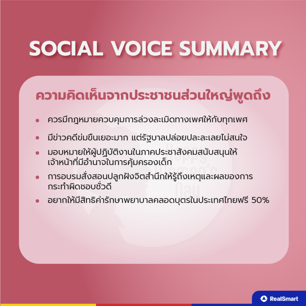 จากภาพรวมความคิดเห็นของคนไทยนั้นทั้งหมดไปในทิศทางเดียวกัน ไม่ว่าจะเป็น คนไทยมองว่ากฎหมายควบคุมการละเมิดทางเพศในไทยยังไม่เข้มงวด อยากให้แก้ไขกฎหมายมาตรา 287 ให้มีบทลงโทษอย่างจริงจังกับกลุ่มคนเหล่านี้ และกฎหมายนั้นต้องคุ้มครองทุกเพศ รวมถึงอยากให้มีสิทธิค่ารักษาพยาบาลคลอดบุตรในไทยฟรี 50% หลายครั้งเหตุการณ์ที่เกิดขึ้นนั้นพฤติกรรมส่วนใหญ่เริ่มจากปัญหาครอบครัว ควรมีการอบรมสั่งสอนปลูกฝังจิตสำนึกให้รู้ถึงความผิดชอบชั่วดี