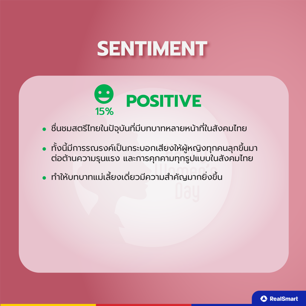 ในส่วนของความเห็นเชิงบวก (Positive Sentiment) 15% ที่ออกมาชื่นชมผู้หญิงไทยในปัจจุบันที่มีบทบาทหน้าที่ในสังคม มีการรณรงค์เป็นกระบอกเสียงให้ผู้หญิงหลาย ๆ คนลุกขึ้นต่อต้านความรุนแรง และการคุกคามในทุกรูปแบบ ทำให้บทบาทแม่เลี้ยงเดี่ยวมีความสำคัญมากยิ่งขึ้น