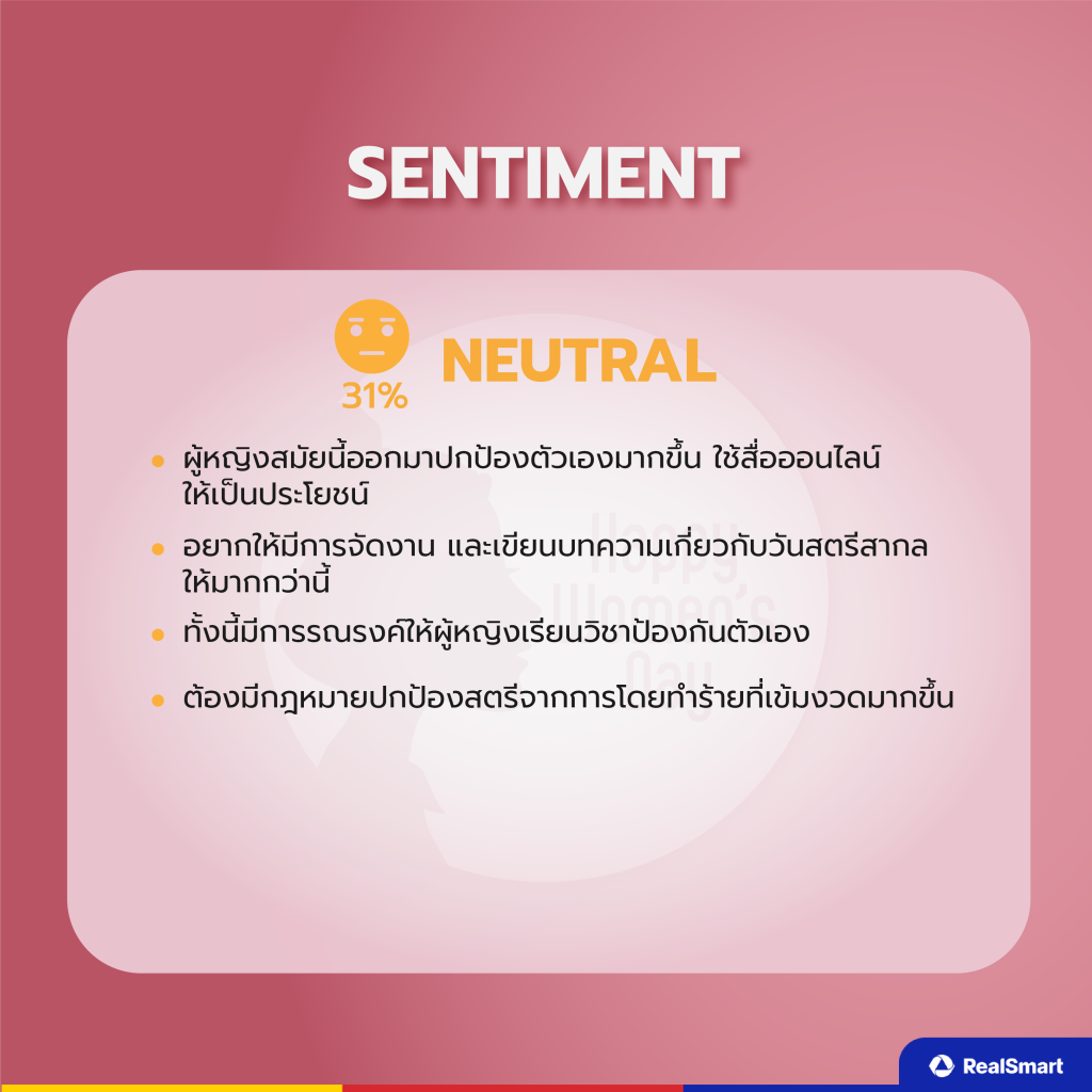 ในส่วนของความเห็นเชิงทั่วไป (Neutral Sentiment) 31% บอกว่าผู้หญิงสมัยนี้ออกมาปกป้องตัวเองมากยิ่งขึ้น โดยการใช้โซเชียลมีเดียให้เป็นประโยชน์ อยากให้มีการจัดงาน การเขียนบทความ รณรงค์เกี่ยวกับวันสตรีสากลมากกว่านี้ รวมถึงต้องมีกฎหมายที่ปกป้องสตรีจากการถูกกระทำอย่างเข้มงวด