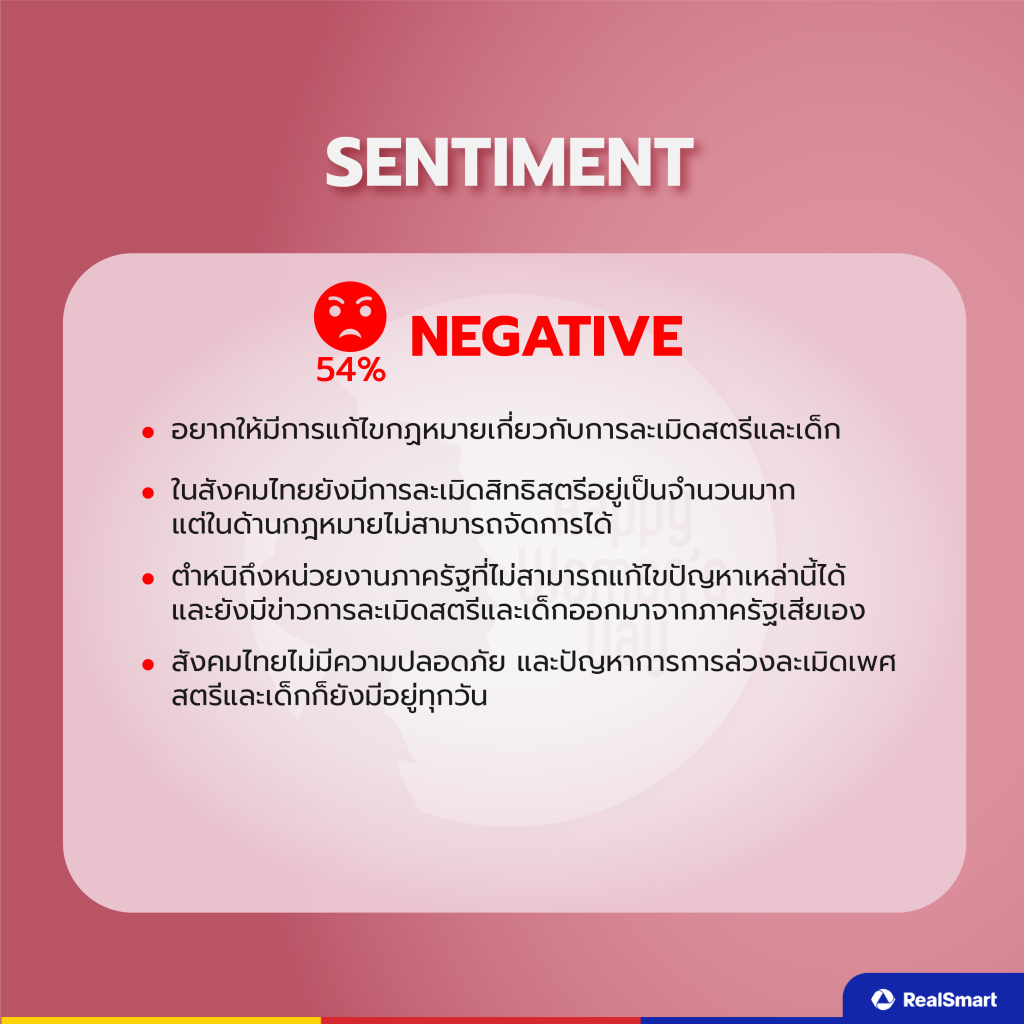 ความคิดเห็นเชิงลบ (Negative Sentiment) 54% บอกว่าอยากให้มีการแก้ไขกฎหมายเกี่ยวกับการละเมิดทางเพศในกลุ่มสตรี และเด็ก ในปัจจุบันสังคมไทยยังคงเกิดเหตุการณ์แบบนี้อยู่เป็นจำนวนมาก หลายคนออกมาตำหนิหน่วยงานภาครัฐ ที่ไม่สามารถแก้ปัญหาเหล่านี้ได้ และยังมีข่าวการคุกคาม และละเมิดทางเพศออกมาอยู่ทุกวัน หลายครั้งเหตุการณ์เกิดมาจากทางภาครัฐเสียเอง