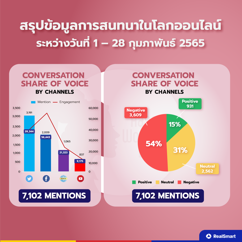 เริ่มต้นกันที่ Timeline ระหว่างวันที่ 1 – 28 กุมภาพันธ์ 2565 ซึ่ง Real Smart ได้แบ่งข้อมูลออกเป็น Engagement และ Mention รวมถึงแบ่งออกเป็นช่องทางต่าง ๆ โดยที่ Twitter นำมาเป็นอันดับที่ 1 ตามมาด้วย Facebook เป็นอันดับ 2 ส่วนอันดับ 3 เป็น Website และ 4 คือ YouTube