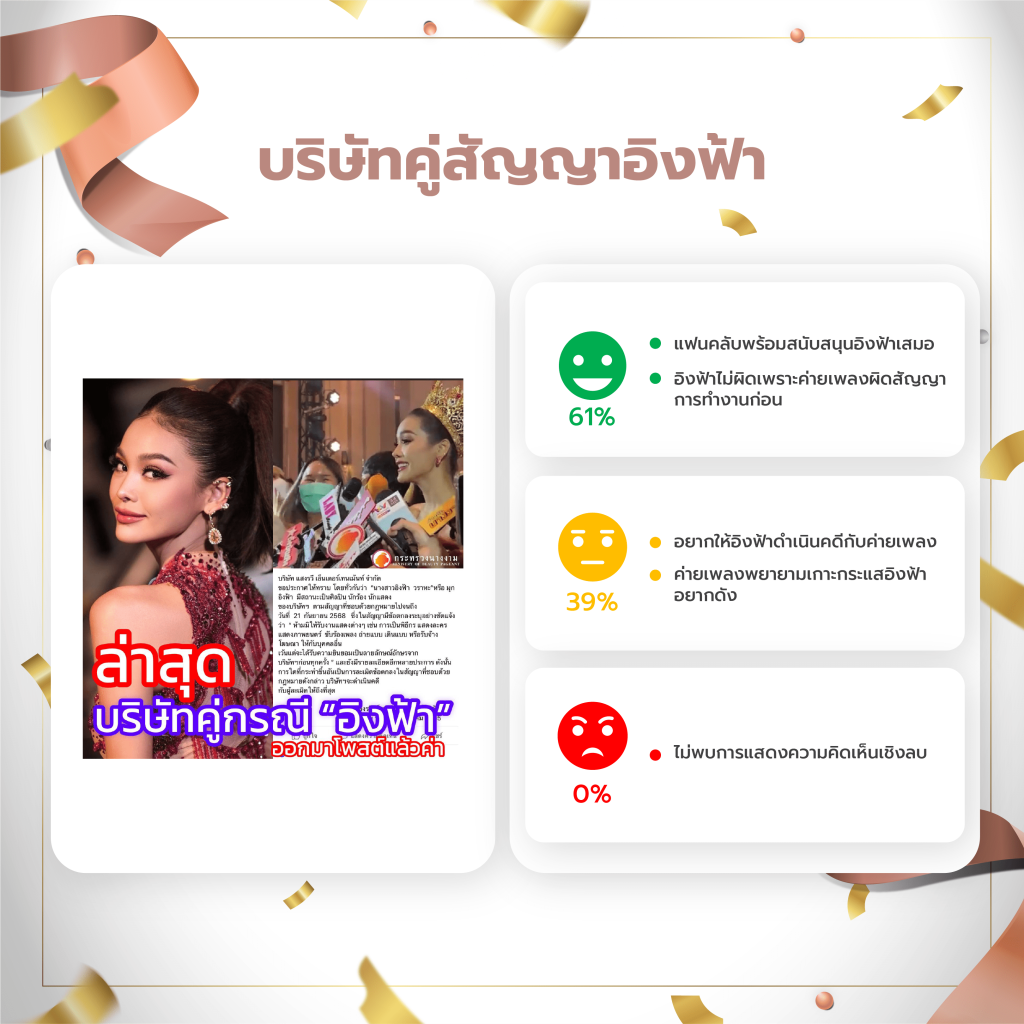 มีความคิดเห็นเชิงบวก (Positive Sentiment) 61% หลายคนที่เป็นแฟนคลับของเธอพร้อมที่จะสนับสนุนอิงฟ้าเสมอ อิงฟ้าไม่ผิดเพราะค่ายเพลงทำผิดสัญญาการทำงานก่อน ต่อมาพบความคิดเห็นทั่วไป (Neutral Sentiment) 39% หลายคนบอกว่าอยากให้อิงฟ้าดำเนินคดีกับค่ายเพลง อีกทั้งค่ายเพลงพยายามเกาะกระแสอิงฟ้า สุดท้ายไม่พบความคิดเห็นเชิงลบ