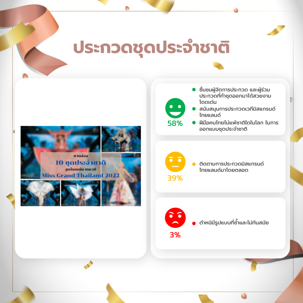 พบความคิดเห็นเชิงบวก (Positive Sentiment) 58% ที่ออกมาชื่นชมผู้จัดการประกวด และผู้เข้าร่วมประกวดมิสแกรนด์ไทยแลนด์ที่ทำชุดออกมาได้สวยงามโดดเด่น ฝีมือคนไทยไม่แพ้ชาติใดในโลกในการออกแบบชุดประจำชาติและพร้อมสนับสนุนการประกวดมิสแกรนด์ไทยแลนด์ ต่อมาพบความคิดเห็นทั่วไป (Neutral Sentiment) 39% หลายคนติดตามการประกวดมิสแกรนด์ไทยแลนด์มาโดยตลอด สุดท้ายพบความคิดเห็นเชิงลบ (Negative Sentiment) 3% ออกมาตำหนิรูปแบบงานที่ซ้ำและไม่ทันสมัย