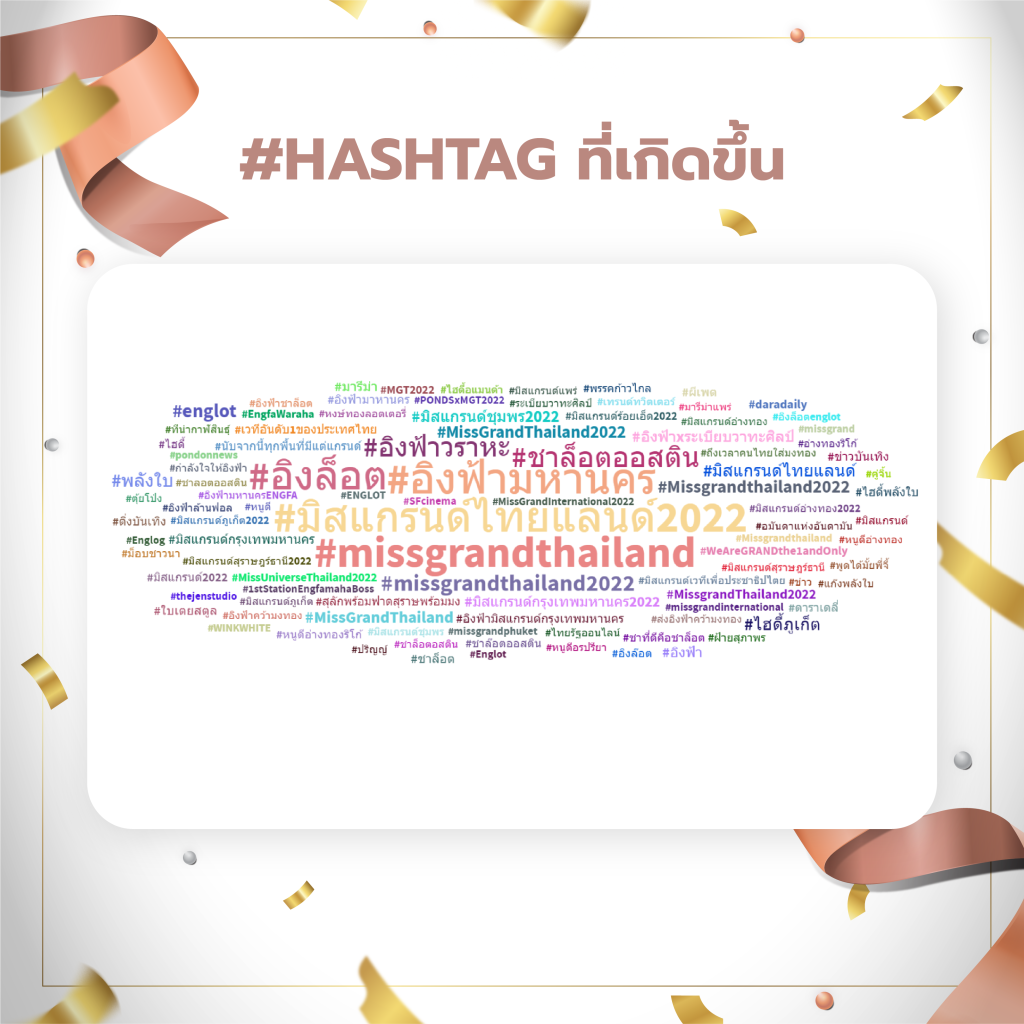 Top #Hashtag ที่เกิดขึ้นเกี่ยวกับประเด็นมิสแกรนด์ไทยแลนด์ แต่ที่เห็นได้ชัดเจนจะเป็นทั้งภาษาไทยและภาษาอังกฤษ #อิงฟ้ามหานคร #มิสแกรนด์ไทยแลนด์#missgrandthailand และอื่น ๆ หากใครสนใจสามารถไปตามดูใน Hashtag เกิดขึ้นได้เช่น