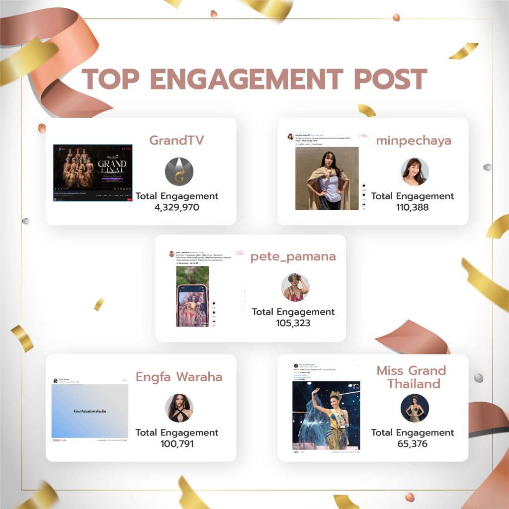 โดย Top Engagement Post ทั้งหมดที่เห็นในรูปนั้นเป็นบุคคล หรือช่องทางที่ติดตาม หรือเกี่ยวข้องกับงานประกวดมิสแกรนด์ไทยแลนด์ทำให้ได้รับความนิยมสูง ซึ่ง GrandTV ได้รับ Engagement มากที่สุดเนื่องจากเป็นช่องทางหลักในการติดตามเวทีมิสแกรนด์ไทยแลนด์