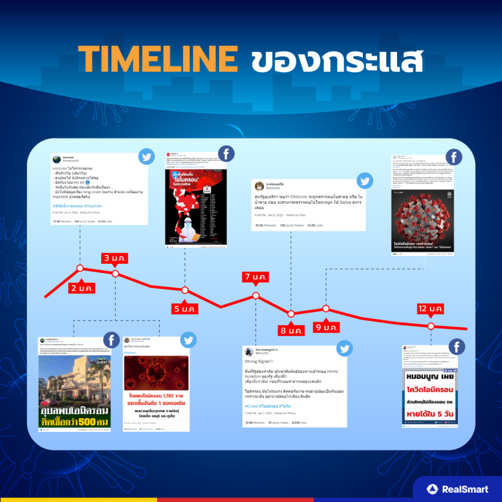 เพียงแค่วันแรกของปี 2565 ตัวเลขของผู้ติดเชื้อเพิ่มขึ้นอย่างรวดเร็ว คนไทยเริ่มหันมาพูดถึงและติดตามสถานการณ์นี้โดยทันทีจะเห็นได้ว่ากราฟดีดตัวขึ้นสูงในวันที่ 2 มกราคม 2565 มี Twitter ส่วนตัวได้ tweet ถึงอาการของโควิดโอไมครอนที่ไม่ได้เบาอย่างที่คิดทั้งอาการ การแพร่ระบาดที่ง่ายมาก ทำให้มีคน Retweet และ Quote tweet สูง ต่อมาในวันที่ 3 มกราคม 2565 Facebook page : สำนักข่าว ‘ไทยรัฐนิวส์โชว์’ โพสต์ข่าวคลัสเตอร์ใหญ่ในจังหวัดอุบลฯ พบผู้ติดเชื้อกว่า 500 คน รวมถึงมี Twitter ส่วนตัวออกมา tweet ว่าประเทศไทยนั้นพบผู้ติดเชื้อโควิดโอไมครอน 1,780 ราย มากที่สุดในเอเชีย