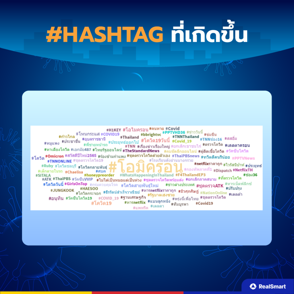 Top #Hashtag ที่เกิดขึ้นเกี่ยวกับสถานการณ์การแพร่ระบาดของโอไมครอนนั้นมีอยู่มากมาย แต่ที่เห็นได้ชัดเจนจะเป็น #โอมิครอน #ชุดตรวจโควิดด้วยตัวเอง #โควิด19 และอื่น ๆ หากใครสนใจสามารถไปตามดูใน Hashtag เกิดขึ้นได้เช่นกัน