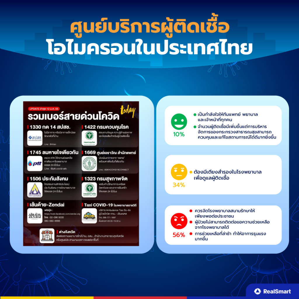 “ศูนย์บริการผู้ติดเชื้อโอไมครอนในประเทศไทย”มี 10% ที่ออกมาให้กำลังใจทีมแพทย์ พยาบาล และเจ้าหน้าที่ทุกคนที่ให้ความช่วยเหลือผู้ติดเชื้อถึงแม้มีจำนวนผู้ติดเชื้อเยอะขึ้น แต่ยังสามารถบริหารจัดการได้ดี ส่วน 34% มองว่าต้องมีเตียงสำรองในโรงพยาบาลเพื่อดูแลผู้ติดเชื้อ แต่ส่วนใหญ่ที่มีสูงถึง 56% มองว่าโรงพยาบาลสนามให้เพียงพอต่อประชาชน และความช่วยเหลือนั้นล่าช้า รวมถึงไม่สามารถติดต่อโรงพยาบาลได้