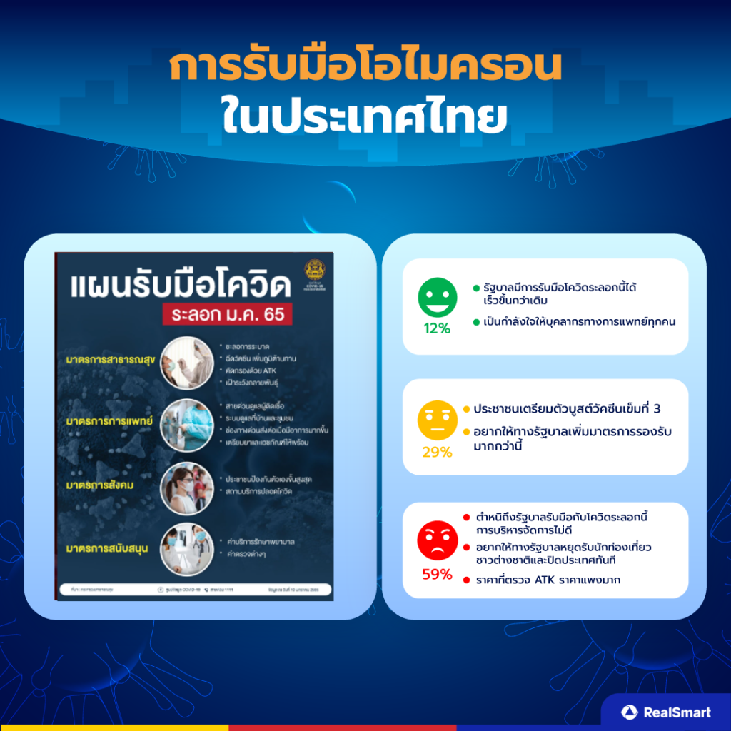 “การรับมือโอไมครอนในประเทศไทย”มีอยู่ 12% มองว่ารัฐบาลมีการรับมือการแพร่ระบาดระลอกนี้เร็วกว่าเดิม และเป็นกำลังใจให้กับบุคลากรทางการแพทย์ทุกคน อีก 29% บอกว่าประชาชนเตรียมบูสต์วัคซีนเข็มที่ 3 เลย รวมถึงอยากให้รัฐบาลเพิ่มมาตรการรองรับให้มากกว่านี้ แต่ส่วนใหญ่กว่า 59% ตำหนิรัฐบาลที่บริหารจัดการการระบาดระลอกนี้ไม่ดี ช่วยหยุดรับนักท่องเที่ยวต่างชาติเข้ามาในไทยทันที รวมถึงราคาชุดตรวจ ATK แพงมาก