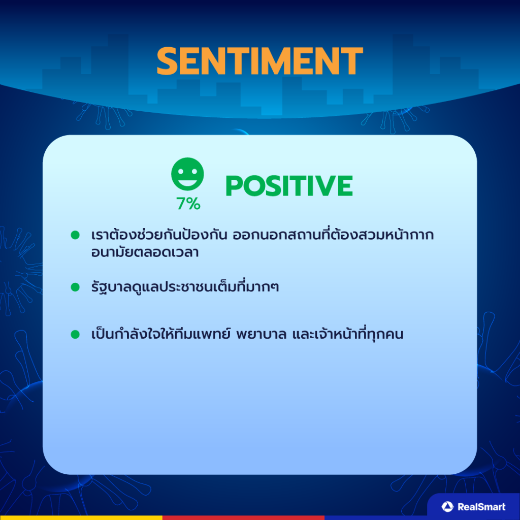 Positive sentiment (ความเห็นเชิงบวก) 7% บอกว่าเราต้องป้องกันตัวเองเสมอเมื่อออกไปสถานที่ต่าง ๆ สวมใส่หน้ากากอนามัยตลอดเวลา และมองว่ารัฐบาลดูแลประชาชนเต็มที่มาก ๆ รวมถึงเป็นกำลังใจในทีมแพทย์ พยาบาล และเจ้าหน้าที่ทุกคน
