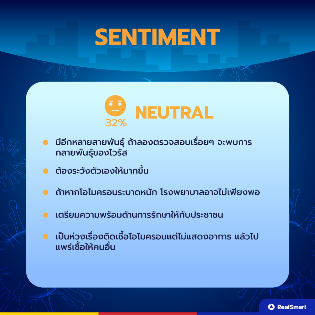 Neutral Sentiment (ความเห็นเชิงทั่วไป) 32% มองว่าเราต้องระมัดระวังตัวมากขึ้น หากติดขึ้นมากลัวว่าจะไม่แสดงอาการแล้วไปแพร่เชื้อให้คนอื่นยิ่งทำให้เกิดการแพร่ระบาดหนัก อาจส่งผลให้เตียงตามโรงพยาบาลต่าง ๆ ไม่เพียงพอ
