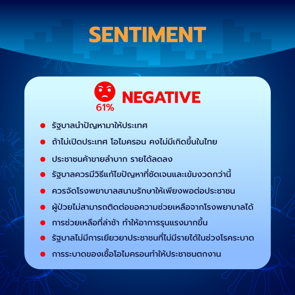 Negative Sentiment (ความเห็นเชิงลบ) 61% มองว่าถ้ารัฐบาลไม่เปิดประเทศ โอไมครอนก็ไม่เข้ามาในไทยหรอก พอเป็นแบบนี้ประชาชนก็ค้าขายลำบาก รายได้ลด ส่งผลต่อภาพรวมของเศรษฐกิจมากขึ้น ยิ่งการแพร่ระบาดที่สูงขึ้นผู้ติดเชื้อที่ต้องการเตียงก็ไม่สามารถติดต่อหน่วยงานได้ ความช่วยเหลือก็ล่าช้า รัฐบาลควรหาวิธีแก้ปัญหาให้ชัดเจนกว่านี้
