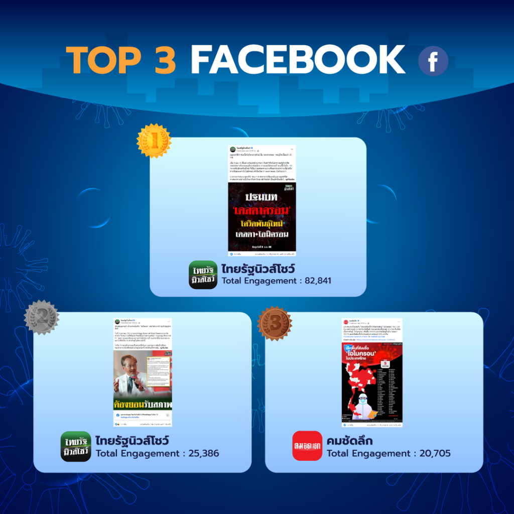 Facebook ยังคงเป็นช่องทางหลักในการอัปเดตสถานการณ์ต่าง ๆ ซึ่งจะเห็นได้ว่าทั้ง 2 Facebook page ที่รับ engagement สูงนั้นเพราะว่าเป็นสำนักข่าวชื่อดังที่รายงานข่าวได้อย่างรวดเร็ว พร้อมกับมีผู้ติดตามใน Facebook สูงอยู่แล้ว