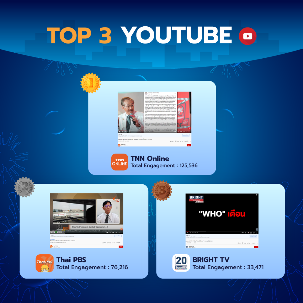 ปัจจุบันคนไทยหันมาเสพข่าว หรือติดตามสถานการณ์ต่าง ๆ ผ่าน YouTube จึงจะเห็นได้ว่า YouTube Channel ทั้ง 3 ช่องนั้นเป็นสำนักข่าวชื่อดังระดับประเทศที่ออกมานำเสนอข่าวสถานการณ์การแพร่ระบาดของโอไมครอนอยู่ตลอดจึงทำให้ได้รับ engagement ที่สูงเป็น 3 อันดับแรก