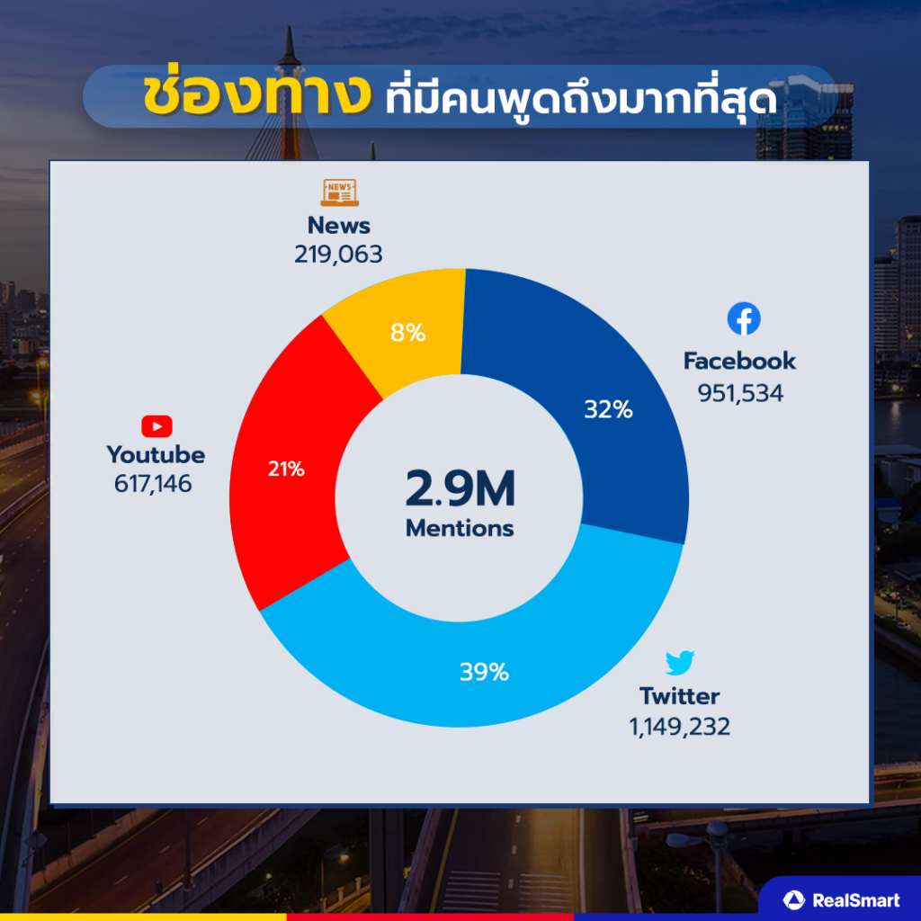 มีการพูดถึงประเด็นนี้ในช่องทางต่างๆ ทั้งหมด 2,914,760 engagement และเราได้ทำการแบ่งแยกข้อมูลออกแบ่งออกเป็นแพลตฟอร์มต่างๆ ทั้ง Twitter, Facebook, YouTube และ News