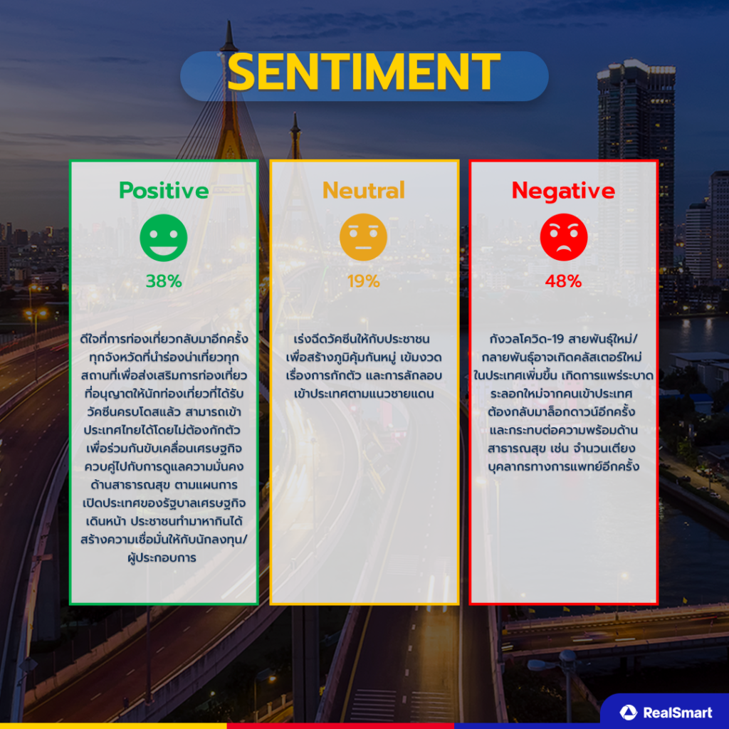 โดยภาพรวมแล้ว มี Positive Sentiment 38% ดีใจที่การท่องเที่ยวจะกลับมาอีกครั้ง เศรษฐกิจจะได้ฟื้นตัว มีรายได้จากนักท่องเที่ยวต่างชาติที่ฉีดวัคซีนครบโดส พร้อมเป็นการสร้างความเชื่อมั่นต่อนักธุรกิจและนักลงทุน ต่อมาในส่วนของ Neutral Sentiment 19% กลุ่มคนนี้มองว่าควรเร่งฉีดวัคซีนให้กับประชาชน เพื่อสร้างภูมิคุ้มกันหมู่ รวมถึงอยากให้เข้มงวดเรื่องการกักตัว และการลักลอบเข้าประเทศตามชายแดน แน่นอนมีกลุ่มคนที่ไม่เห็นด้วยที่เป็น Negative Sentiment 48% พวกเขากังวลโควิด-19 สายพันธุ์ใหม่หรือกลายพันธุ์ที่อาจเกิดคลัสเตอร์ใหม่อีก ซึ่งจะส่งผลให้ต้องมีการล็อคดาวน์อีกครั้ง รวมถึงกระทบต่อความพร้อมด้านสาธารณสุข