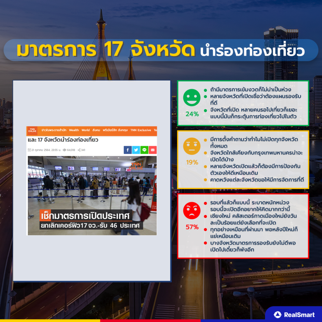 “มาตรการ 17 จังหวัดนำร่องท่องเที่ยว” มาตรการที่ช่วยให้มีความปลอดภัยมาขึ้น ซึ่งช่วยคลายกังวล โดยเชื่อว่าหลายพื้นที่เตรียมพร้อมได้ดี มีนักท่องเที่ยวรอไปเที่ยวเยอะ และช่วยกระตุ้นเศรษฐกิจไปในตัว ทำให้มี Positive Sentiment 24% แต่ยังมีคำถามถึงเหตุผลที่ไม่เปิดทุกจังหวัด ส่วนหลายจังหวัดที่เปิดแล้วคาดหวังว่าต้องมีการเตรียมพร้อมที่ดี ทำให้มี Neutral Sentiment 19% ส่วนอีกคนอีกกลุ่มที่มองว่าจะกลายเป็นเหมือนรอบที่แล้ว มีการแพร่ระบาดหนัก ตอนนี้เชียงใหม่มีคลัสเตอร์วันละร้อยราย แต่ก็ยังเลือกที่จะเปิดประเทศ พอหลังปีใหม่ก็กลับมาแย่เหมือนเดิม เพราะบางจังหวัดไม่มีการเตรียมพร้อมที่ดี ทำให้มี Negative Sentiment 57%