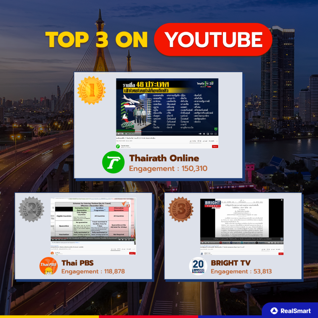 ช่องทาง YouTube เป็นอีกช่องทางที่คนไทยใช้ในการดูข่าว โดย 3 ช่องนี้เป็นสำนักข่าวดังที่หลายคนติดตาม ได้ออกมาพูดถึงประเด็นการเปิดประเทศ มาตรการรับนักท่องเที่ยวต่างชาติว่าประเทศไหนสามารถเข้ามาได้ไม่ต้องกักตัว