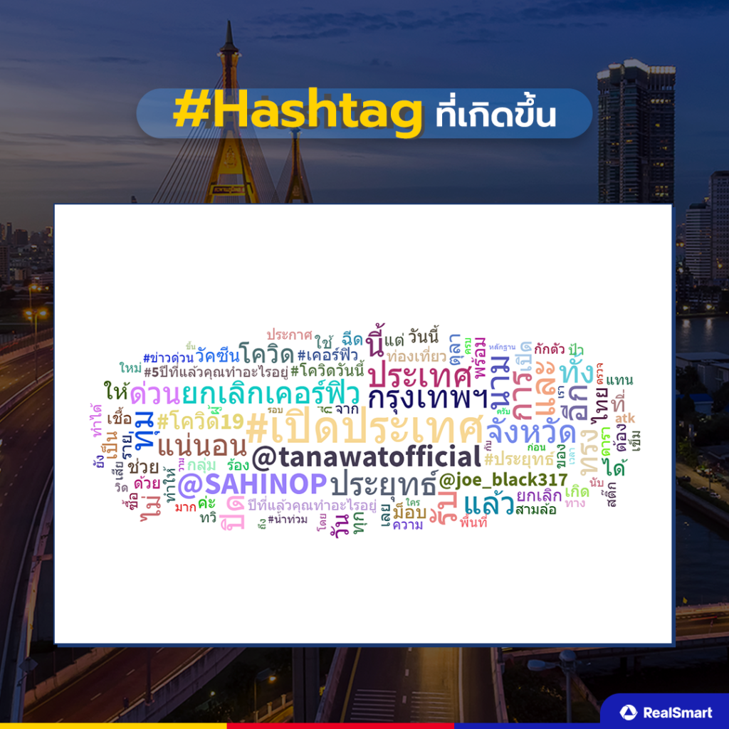 #Hashtag ที่เกิดขึ้นนั้นเกี่ยวกับประเด็นเปิดประเทศ เราเห็นได้ชัด เช่น #เปิดประเทศ #ประยุทธ์ #โควิด19 และอื่นๆ