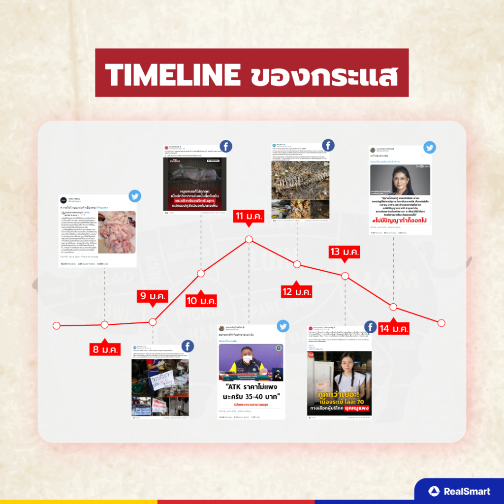 ต่อมากราฟไต่ระดับลงเรื่อย ๆ ตั้งแต่วันที่ 12 – 14 มกราคม 2565 ซึ่งในวันที่ 12 มกราคม 2565 ทาง Facebook page : PPTV 36 โพสต์รายงานข่าวเกี่ยวกับพบซากหมูจำนวนมากที่ถูกยัดทิ้งไว้ในโอ่งในฟาร์มหมูที่ จ.นครปฐม ที่หมูในฟาร์มติดโรค ASF และไม่กล้ารายงานไปยังกรมปศุสัตว์ เพราะกลัวโดนสั่งปิดฟาร์ม ต่อมาวันที่ 13 มกราคม 2565 ทาง Facebook page : SentangSedtee โพสต์ถึงราคาเนื้อจระเข้ที่มีราคาถูกเพียงกิโลกรัมละ 70 บาท เป็นทางเลือกใหม่ให้ผู้บริโภคในยุคที่หมูแพง