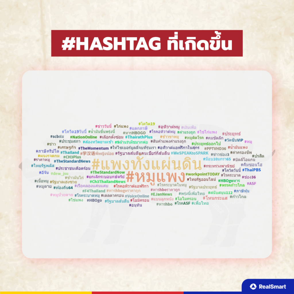 Top #Hashtag ที่เกิดขึ้นเกี่ยวกับประเด็นหมูแพงมีอยู่มากมาย แต่ที่เห็นได้ชัดเจนจะเป็น #หมูแพง #แพงทั้งแผ่นดิน #โรคระบาดในหมู และอื่น ๆ หากใครสนใจสามารถไปตามดูใน Hashtag เกิดขึ้นได้เช่นกัน