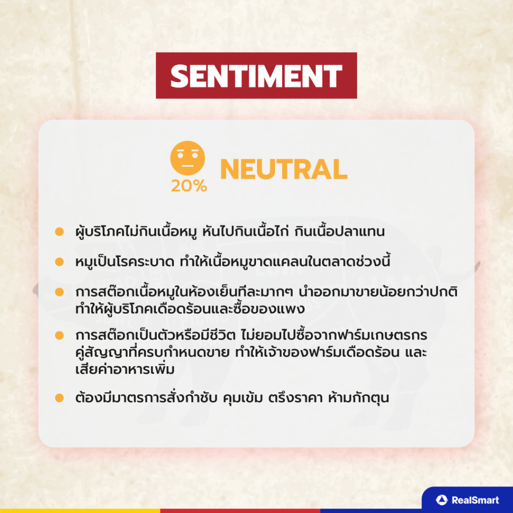 Neutral Sentiment (ความเห็นเชิงทั่วไป) 20% บอกว่าคนไม่ทานเนื้อหมู หันไปทานเนื้อไก่และปลาแทน เนื่องจากหมูเป็นโรคระบาดทำให้ขาดแคลน ไม่พอต่อความต้องการบริโภคของผู้คน และมองว่ามีการสต๊อกเนื้อหมูไว้เยอะ ๆ แต่ปล่อยออกมาขายทีละน้อย ๆ จึงอยากให้มีมาตรการสั่งกำชับ คุมเข้ม ตรึงราคา และห้ามกักตุนเนื้อหมู