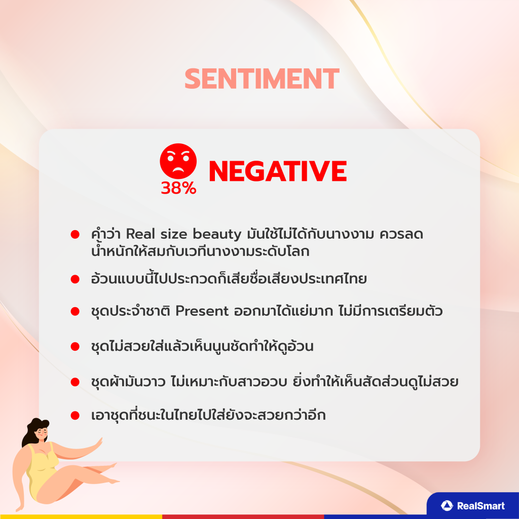 Negative Sentiment (ความเห็นเชิงลบ) 38% มองคำว่า Real Size Beauty มันใช่ไม่ได้กับนางงาม ควรลดน้ำหนักให้สมกับเวทีนางงามระดับโลก และชุดประจำชาติ Present ออกมาได้แย่มาก ไม่มีการเตรียมตัว ส่วนชุดประกวดผ้ามันวาวไม่เหมาะสมกับสาวอวบ ยิ่งทำให้เห็นสัดส่วนดุไม่สวย เอาชุดที่ชนะที่ไทยไปใส่ยังจะสวยกว่าอีก