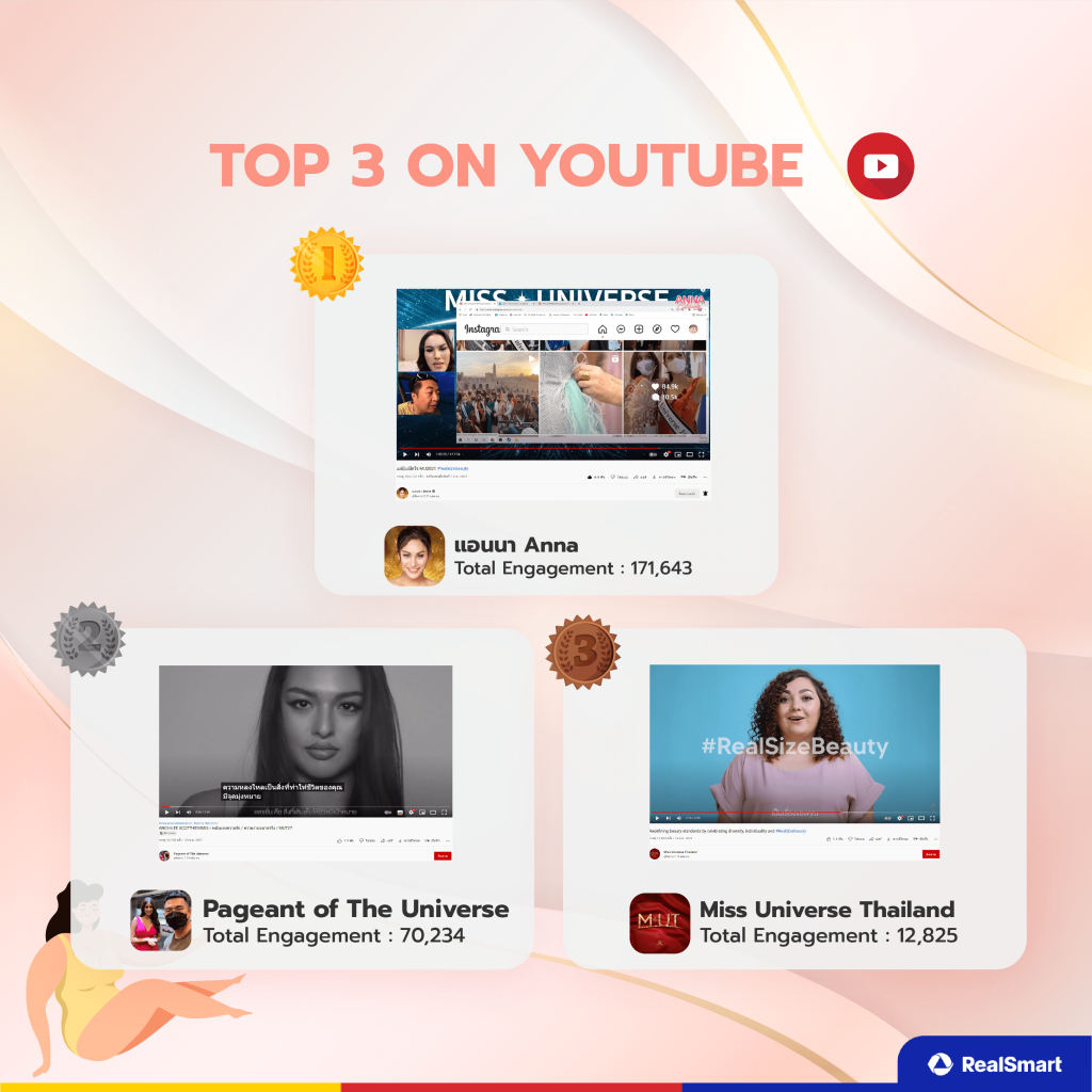 YouTube Channel ทั้ง 3 อันดับเป็นช่องที่มีผู้ติดตามและมีคอนเทนต์เกี่ยวกับการประกวดเต็ม ๆ ทั้งการอัปเดตและติดตามข่าวสารอย่างใกล้ชิด จึงได้รับความสนใจจากผู้คน