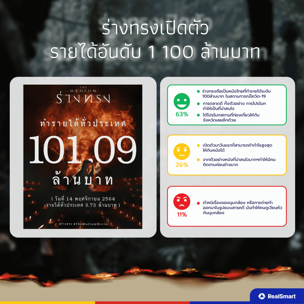 • Positive (เชิงบวก) 63% ชื่นชมการตลาดและการโปรโมท “ร่างทรง” ทำได้อย่างน่าสนใจ และยังเป็นการโปรโมทการท่องเที่ยวให้จังหวัดเลยไปในตัว