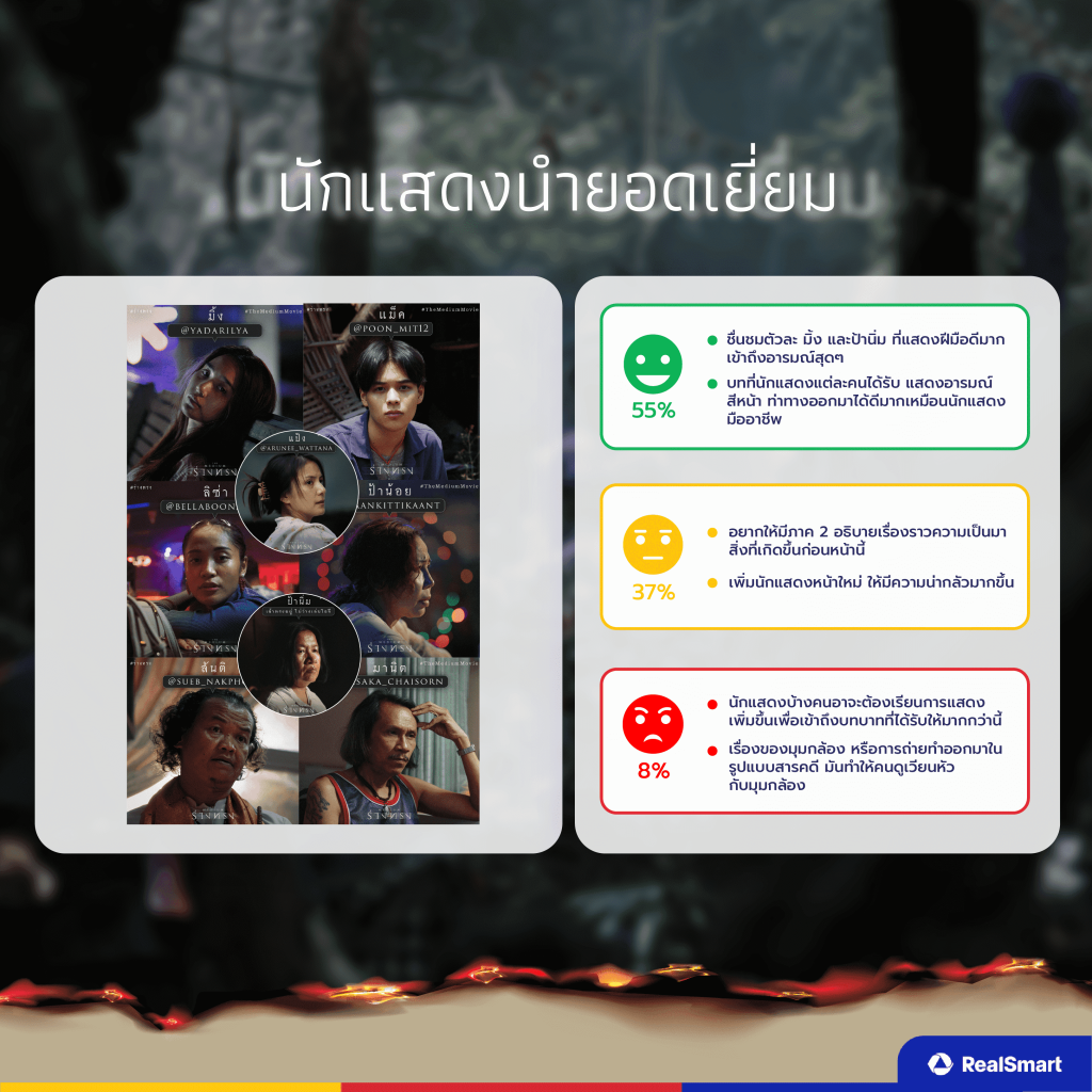 • Negative (เชิงลบ) 8% นักแสดงบางคนอาจจะต้องเรียนการแสดงเพิ่มเพื่อเข้าถึงบทบาทให้มากกว่านี้