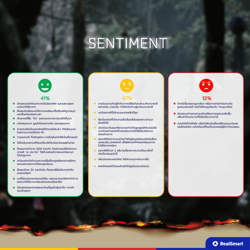 • Positive (เชิงบวก) 45% หลายคนชื่นชมการทำงาน GDH ร่วมกับโปรดิวเซอร์ชื่อดังจากเกาหลีใต้ที่ทำหนังบอกเล่าตำนานความเชื่อเรื่องภูตผีของภาคอีสาน ทำให้หนังนั้นน่าดูมาก ๆ