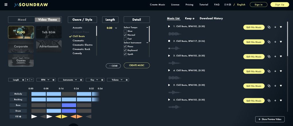 หากกำลังหาเพลงประกอบวิดีโอ SOUNDRAW จะช่วยสร้าง soundtrack ให้อย่างรวดเร็ว โดยสามารถเลือกอารมณ์หรือประเภทงานวิดีโอ สไตล์เพลง ความยาว จังหวะ เครื่องดนตรี แล้วโปรแกรมจะสร้างเพลงมาให้ในเวลาไม่ถึงนาที นอกจากนี้ยังสามารถปรับแต่งหรือสร้างเพลงที่คล้ายกันต่อได้ด้วย และที่สำคัญผลงานที่สร้างออกมายังเป็นแบบ Royalty-free ที่สามารถโหลดไปใช้ได้เลยโดยไม่มีลิขสิทธิ์ และไม่ต้องสมัครใด ๆ
